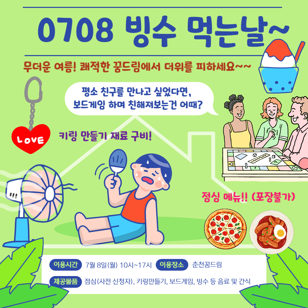 7월 8일 무더운 여름을 맞이해야하는 우리 친구들을 위해 꿈드림에서 여러분들을 초대합니다! - 언제?? 7월 8일 10시~17시 [4시까지는 방문주셔야 하며, 재료가 소진될 시 이용이 어렵습니다ㅜ] - 어디서?? 춘천꿈드림 - 누구와?? 춘천꿈드림 친구들과 - 무엇을?? 시원한 빙수도 먹고, 맛있는 점심도 먹고, 키링도 만들고, 보드게임도 하고!! - 어떻게?? 재미있게! 적극적인 마음을 가지고! - 왜?? 평소 친구들이랑 친해질 수 있는 기회가 적다고 이야기 하는 친구들의 의견을 반영하고자 ^.^ 무더운 여름도 피할겸! - 시간내에 이용은 자유이되, 점심식사는 사전 신청자들 대상으로 주문할 예정입니다. 피자, 떡볶이 등 친구들이 좋아할 만한 메뉴들로 구상중입니다. 점심식사는 12시에 시작할 예정이니, 점심식사에 참여하고자 하는 친구들은 꼭 사전에 신청해주셔야 합니다! - 보호자는 참여가 어렵습니다..^^ - 해당 프로그램은 드림프로젝트 시간 미인정됩니다. - 상기 내용은 변동될 수 있습니다. |